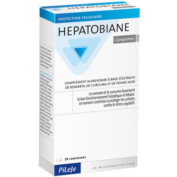 Hepatobiane comprimés de Pileje est un complément alimentaire qui favorise le bon fonctionnement hépatique et biliaire et a une action antioxydante. Hepatobiane comprimés est un complément alimentaire à base de curcuma, de romarin et de poivre noir. L'association du curcuma et du romarin favorise le bon fonctionnement hépatique et biliaire. Le romarin contribue à protéger les cellules contre le stress oxydatif.